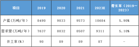 随着各地区新建和扩建装置投产,预计至2023年,世界PP产能达到1.07亿吨/年,2019-2023年产能年平均增速为5.9%。随着疫情和经济的好转以及下游家电等需求增长,估计2023年ABS需求将达9311万吨,2019-2023年需求年均增速为5.1%。(见表1)